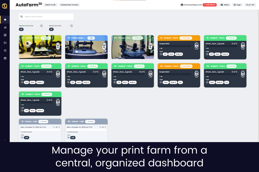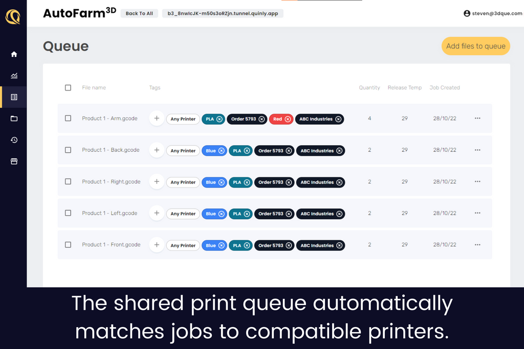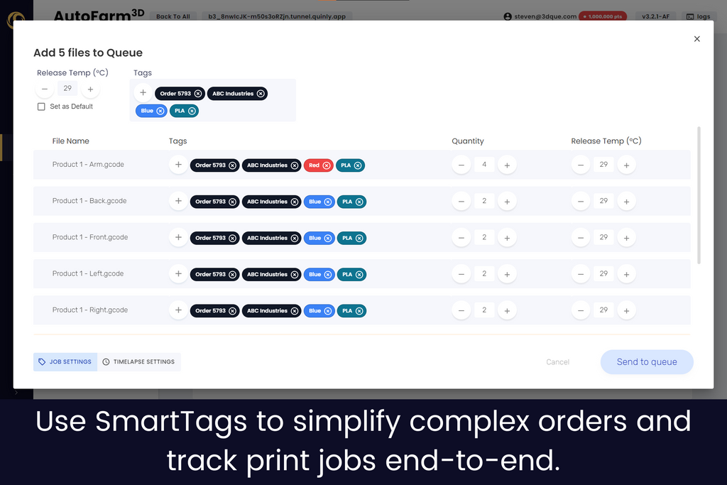 Job Queue with Auto-Dispatch: Queue as many prints as you'd like (there's no limit) and let them print. AutoFarm3D automatically pairs jobs with compatible printers using SmartTags™.