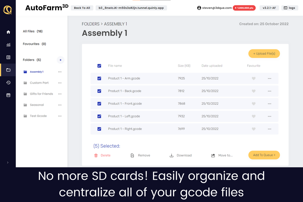 Order Management (Exclusive Preview): Create an order, add files, and let AutoFarm3D take it away! Get real-time order status updates as your prints go through production.
